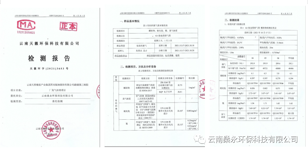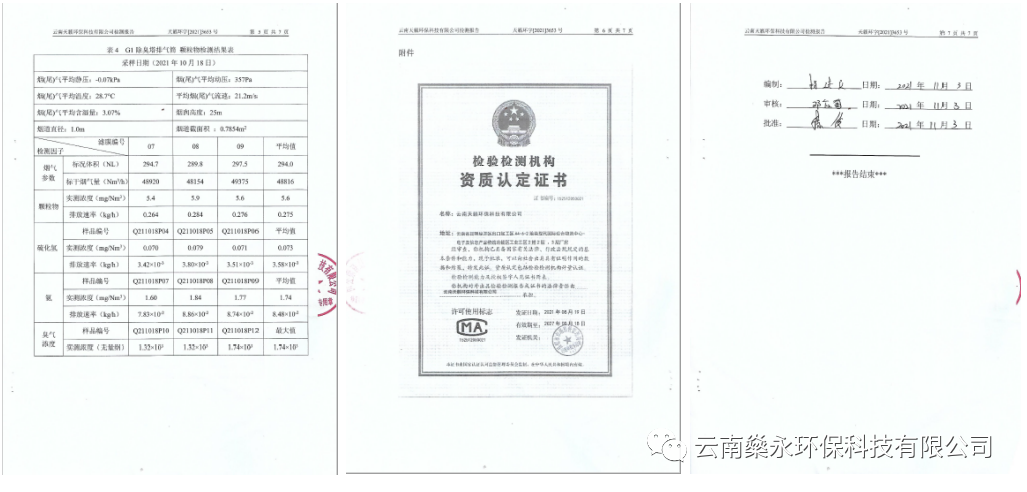 臭气治理成套设备设计、制造严格执行行业标准,经本系统处理后,满足国家和当地污染物排放标准,处理后颗粒物排放浓度为5.6 mg/Nm³、H2S排放浓度在0.073mg/Nm³、NH3浓度在1.740mg/Nm³、臭气浓度为1740(无量纲),排放浓度均低于《恶臭污染物排放标准》(GB14554-1993)。