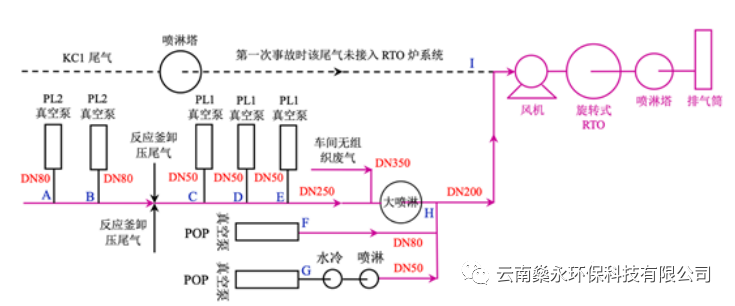 根据相关资料,该企业生产方式为间歇性生产,事故发生时仅POP、PL1/PL2产品的工艺废气通过DN50~DN350不等的金属管道进行了收集(主要污染物为环氧乙烷、环氧丙烷、三甲胺、异丙醇、苯乙烯、丙烯腈等),废气收集后通过引风机进入RTO焚烧,该RTO为R-RTO(旋转式蓄热焚烧炉)。废气收集、处理的详细流程如下图所示。