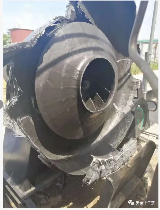 该企业于2021 年6 月3日开始试生产,RTO装置于2021 年6 月6日16:00发生爆炸,整个风机的蜗壳全部粉碎,所幸的是事故没有造成人员伤亡。事故调查显示,由于二甲胺易溶于水(沸点7℃),随着水中二甲胺含量升高及环境温度上升,二甲胺大量挥发,同时因引风机叶轮、蜗壳材质均为玻璃钢材质,虽然有导电涂层,但引风机对地电阻为无穷大,达到爆炸极限的有机废气与高速旋转的风机叶轮摩擦产生静电,导致风机蜗壳粉碎性爆裂。