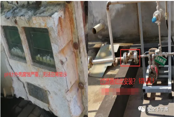 如某企业碱洗塔pH计外壳腐蚀严重,无法观察显示的数值。可能因碱液浓度低影响处理效果,造成RTO内部腐蚀,带来RTO设备变形、坍塌、废气泄漏等安全风险。pH计因长期在酸(碱)环境中工作,一般连续使用2个月后显示就会出现较大的误差,需要人工分析(或标注溶液校准)。
